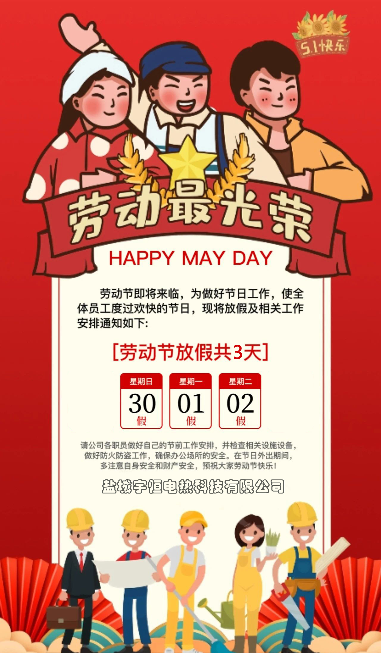 再次感谢您的支持和厚爱,盐城宇恒电热科技有限公司将竭诚为您提供更好的商品与服务,祝您假期愉快!