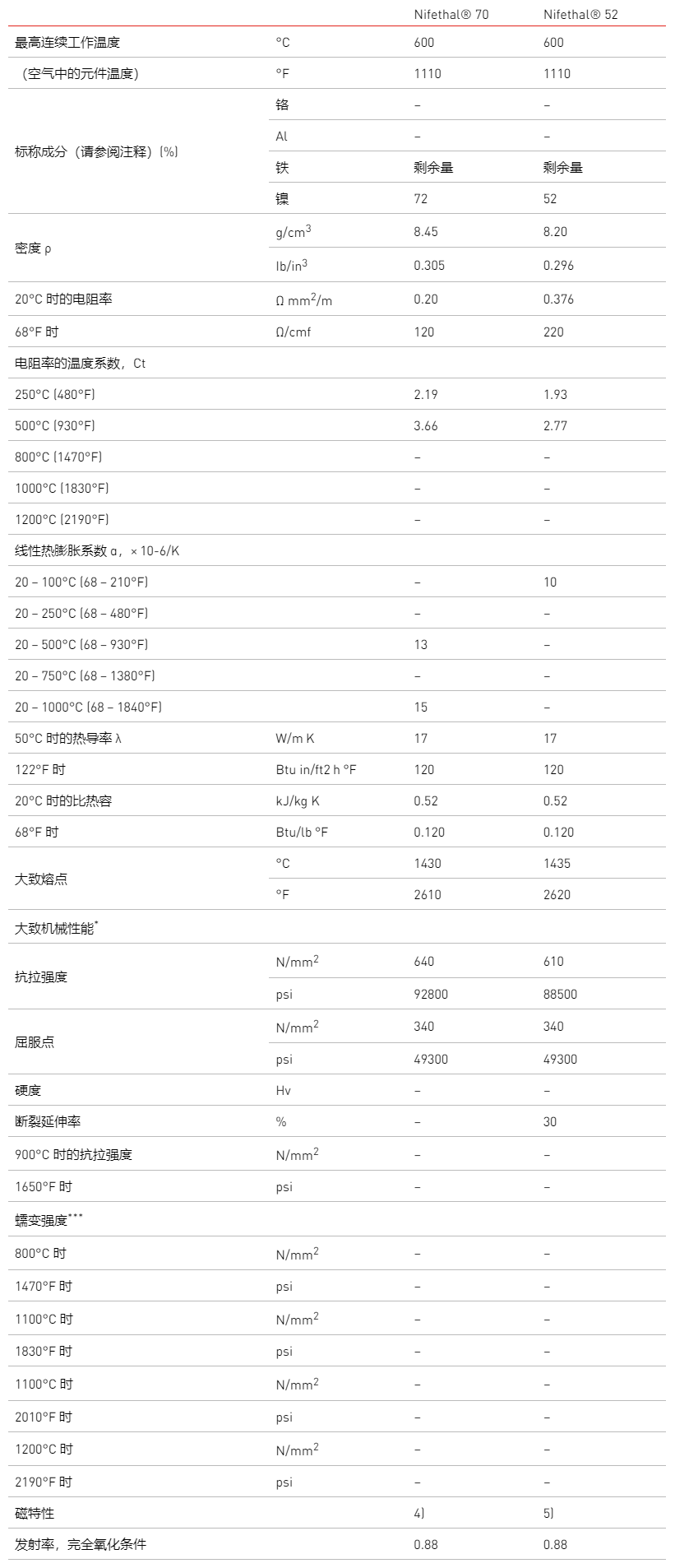 镍铁 (NiFe) 合金,工作温度高达 600°C (1110°F): Nifethal® 70 和 Nifethal® 52 合金具有低电阻率和高电阻温度系数。 正温度系数允许加热元件随着温度升高而降低功率。 典型应用是具有自调节功能的低温管状元件。